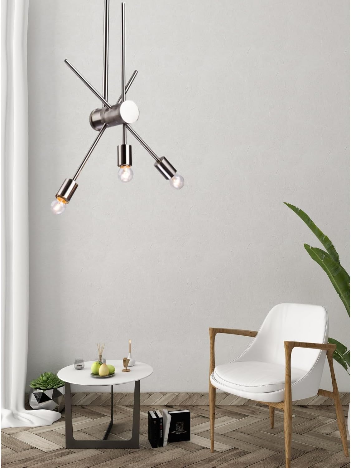 This ceiling fixture is in a shiny nickel finish. It has three arms, and the arms can be moved to different direction.