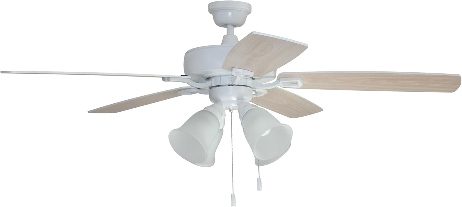 The Twist N Click Express 52 in. Ceiling Fan (Model TCE52W5C4-C) in White by Craftmade is designed for speed, simplicity, and professional efficiency. Featuring the innovative Twist and Click Express mounting system, this fan can be installed in under five minutes with no tools required, making it an excellent solution for contractors, remodelers, and multi unit installations. The 52 inch blade span with reversible 5 MDF blades in White and Washed Oak finishes allows seamless integration into modern or transitional interiors. An integrated 4 light kit includes four 5 watt LED bulbs at 3000K with dimming capability for warm, balanced illumination. Powered by a standard 3 speed reversible AC motor, this fan delivers reliable airflow for year round comfort. Dual mount capability supports flat or angled ceilings up to 23 degrees and includes a 4 inch downrod for standard installations. The Twist N Click Express combines effortless installation with dependable performance.