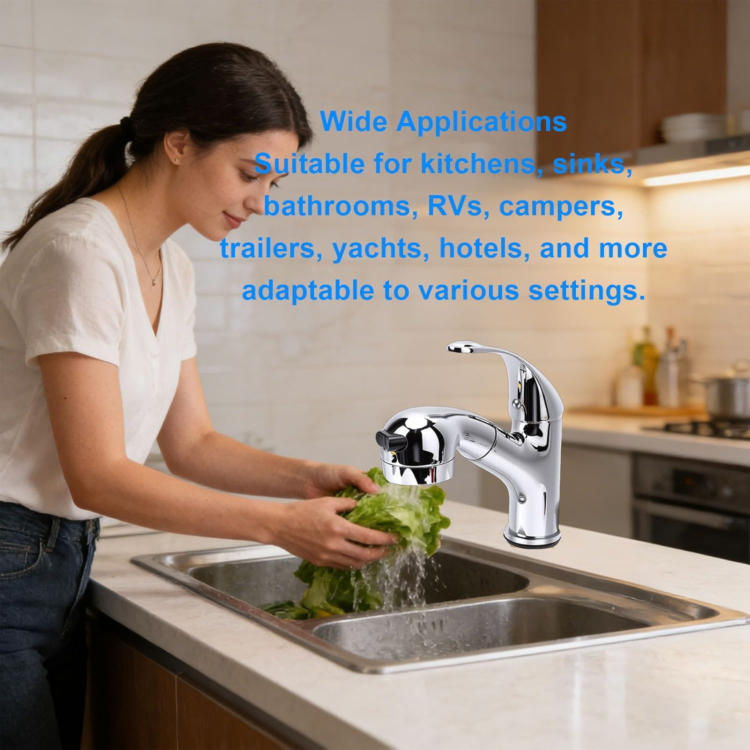 1. Elegant Retro Design: This single handle pull out kitchen faucet features a refined vintage inspired design with a polished Cr plated surface, enhanced by Ti coating for scratch proof and a luxurious shine. 2. Versatile Pull Out Spray And Easy Installation: The flexible pull out spray head enhances convenience for washing dishes and cleaning the sink. Complete with all necessary hardware, installation is quick and easy. 3. High Temperature Ceramic Valve : Equipped with a high temperature fired ceramic , this faucet ensures slick operation, leak proof performance, and a sturdy handle connection. 4. Multi Purpose: Designed for both hot and cold water, this faucet suits kitchens, bathrooms, and utility sinks. Its low maintenance design makes it suitable for homes, hotels, campers, and yachts, combining style with sustainability. 5. Stainless Steel And Copper Construction: Crafted from stainless steel and copper, the faucet offers excellent durability. The polished Cr and Ti plating provide excellent abrasion proof, preventing oil buildup for effortless maintenance. Spec: Item Type: Faucet with Pull Out Sprayer Material: Stainless Steel, Copper, Ceramic Valve Core Surface Treatment: Polished Water: Hot and Cold Water Faucet Installation Hole Cut Diameter: Approx. 35mm / 1.38in Fitment: Replacement for RV, Off Road Vehicle, Yacht, Campers, Stable, etc. Package List: 1 x Faucet (Total 11 Parts)