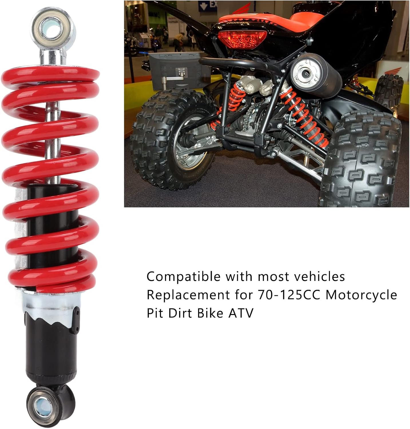 SPECIFICATION:Item Type: Front Rear Shock AbsorberHole Distance: Approx. 230mm / 9.06inSuitable: Replacement for Pit Dirt Bike ATV 70-125CC MotorcycleLoad Bearing: 1000-1200lbsMaterial: MetalPackage List:1 × Front Rear Shock Absorber